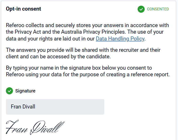 Please read the consent statement, enter your name in the Signature box, and click the green 'I Consent' button. Referoo's Privacy Policy/Data Handling Policy can be found here.