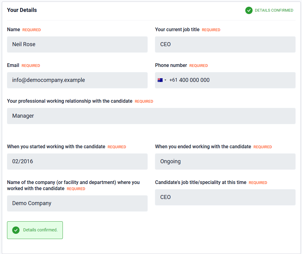 Check the My Details section to ensure the details provided by the candidate are correct. Please review both your contact details and the relationship information that has been entered in and make any changes that are needed before pressing 'Confirm Your Details'.
