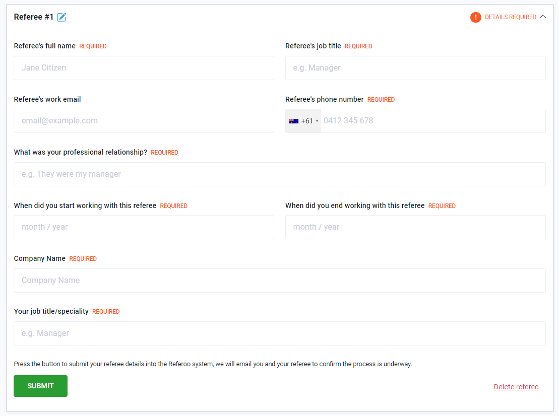 Adding all of the requested details will help each of your referees recall your working relationship with them, and will provide more information to your recruiter/hiring manager when the reference is completed. Each referee will have the opportunity to review and amend these details while completing the reference check.