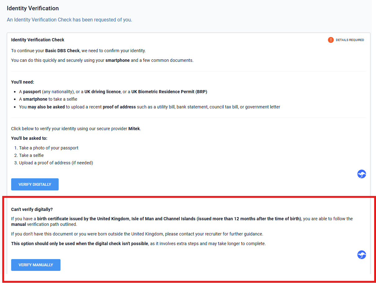 - Once your HR Manager/Recruiter completes your Manual Identity Verification, you may return to your dashboard and proceed with the DBS or Disclosure Scotland check.