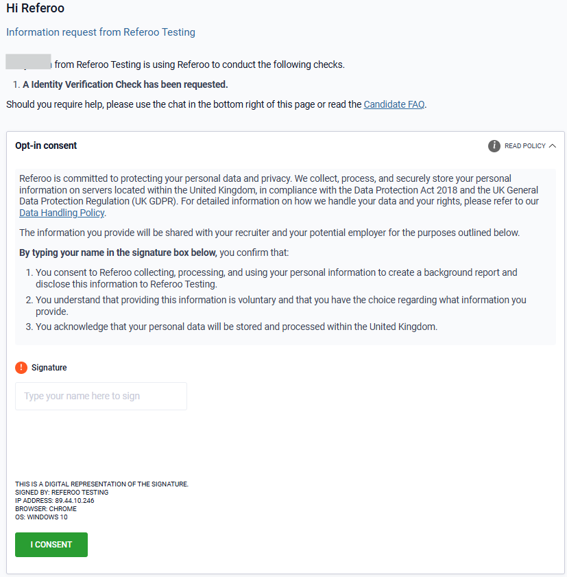 - Press the green 'I Consent' button to consent, save your signature and continue on.